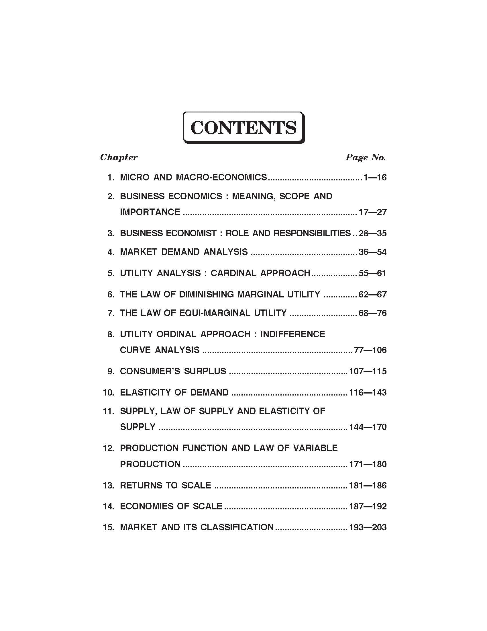 Contents: 1. Micro And Macro-Economics 2. Business Economics : Meaning, Scope and Importance 3. Business Economist : Role And Responsibilities 4. Market Demand Analysis 5. Utility Analysis : Cardinal Approach 6. The Law of Diminishing Marginal Utility 7. The Law of Equi-Marginal Utility 8. Utility Ordinal Approach : Indifference Curve Analysis 9. Consumer’s Surplus 10. Elasticity of Demand 11. Supply, Law Of Supply And Elasticity of Supply 12. Production Function and Law of Variable Production 13. Returns To Scale 14. Economies of Scale 15. Market and Its Classification 16. Price and Output Determination Under Perfect Competition 17. Price and Output Under Monopoly 18. Price and Output Under Imperfect Or Monopolistic Competition 19. Oligopoly 20. Chhattisgarh Economy : Price Controlprice Ceiling And Price Floor 21. Study Chhattisgarh Economy 22. Prospects of Economic Development In Chhattisgarh 23. The Economic Survey of Chhattisgarh