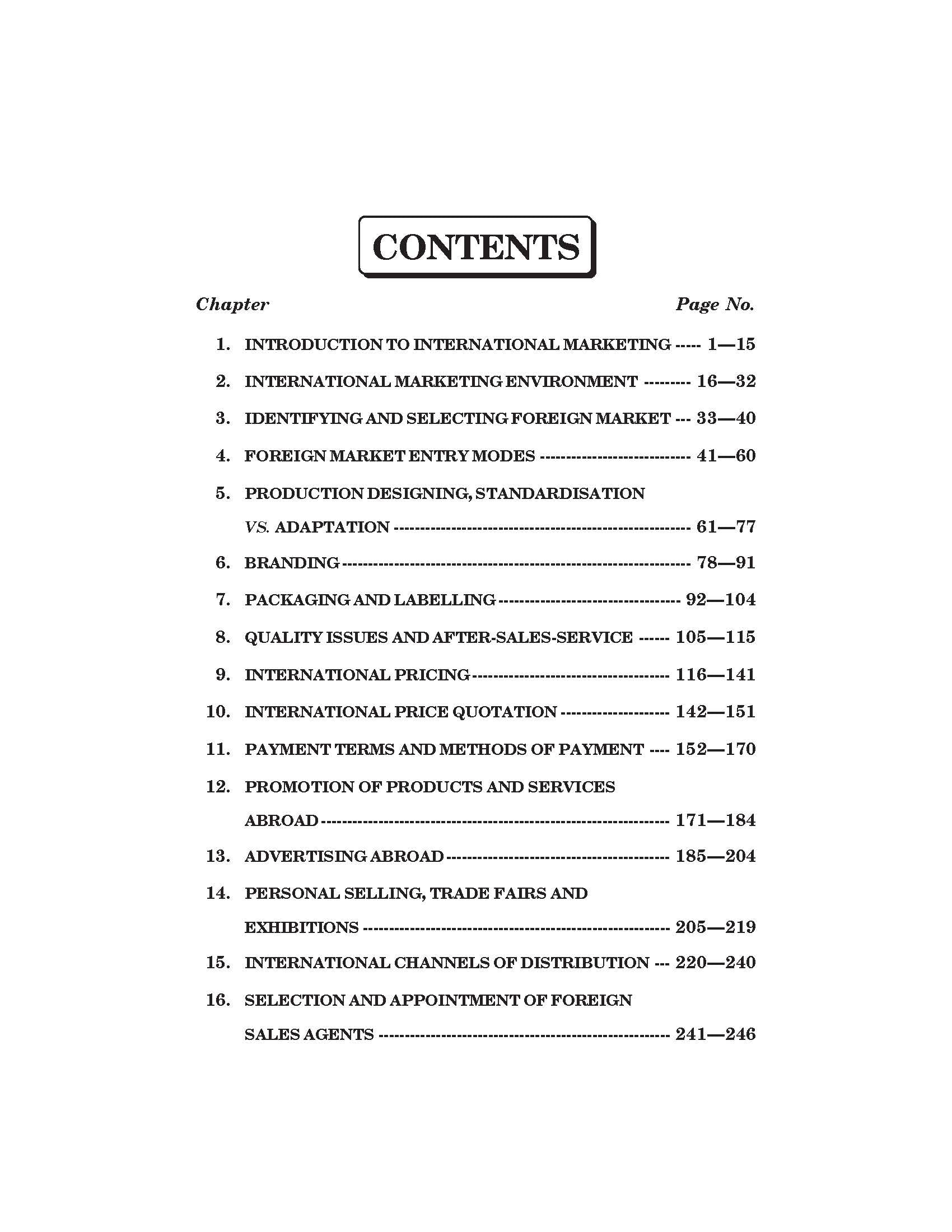 Contents: 1. Introduction To International Marketing 2. International Marketing Environment 3. Identifying And Selecting Foreign Market 4. Foreign Market Entry Modes 5. Production Designing, Standardisation Vs. Adaptation 6. Branding 7. Packaging And Labelling 8. Quality Issues And After-Sales-Service 9. International Pricing 10. International Price Quotation 11. Payment Terms And Methods Of Payment 12. Promotion Of Products And Services Abroad 13. Advertising Abroad 14. Personal Selling, Trade Fairs And Exhibitions 15. International Channels Of Distribution 16. Selection And Appointment Of Foreign Sales Agents 17. Marketing Mix 18. Logistics Decision 19. Export Policy And Practices In India 20. Trends In India's Foreign Trade 21. Steps In Starting Export Business 22. Export Finance 23. Export Documentation And Procedure 24. Export Assistance And Incentives 25. Marketing Control Process ● Annexure
