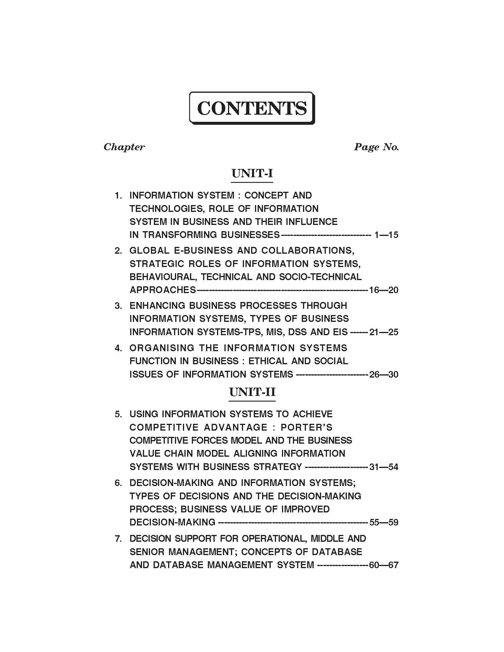 1. Information System : Concept And Technologies, Role of Information System In Business And Their Influence In Transforming Businesses 2. Global E-Business And Collaborations, Strategic Roles Of Information Systems, Behavioural, Technical And Socio-Technical Approaches 3. Enhancing Business Processes Through Information Systems, Types of Business Information Systems-TPS, MIS, DSS And EIS 4. Organising The Information Systems Function In Business : Ethical And Social Issues Of Information Systems