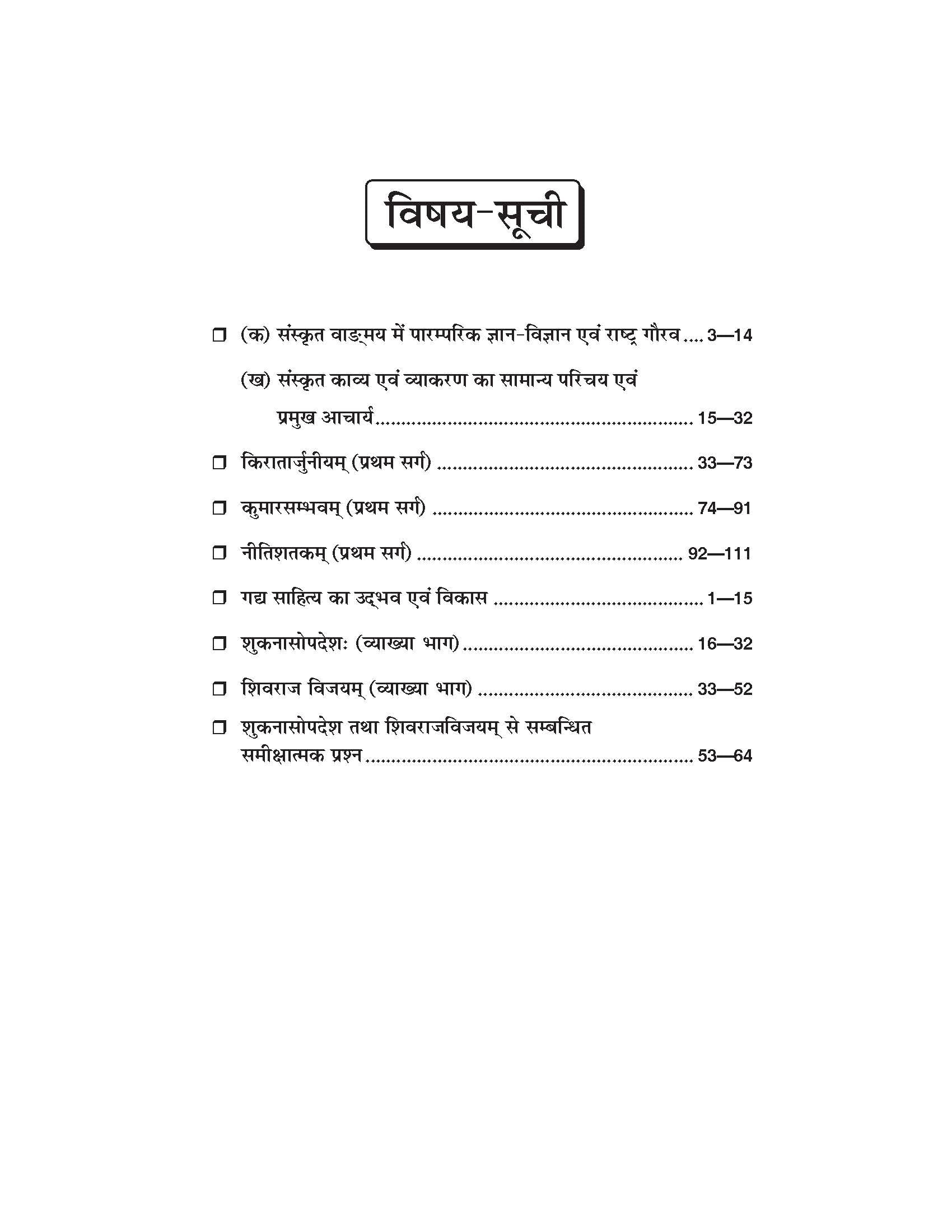 ● किरातार्जुनीयम् (प्रथम सर्ग) ● कुमारसम्भवम् (प्रथम सर्ग) ● नीतिशतकम् (प्रथम सर्ग) ● गद्य साहित्य का उद्भव एवं विकास ● शुकनासोपदेशः (व्याख्या भाग) ● शिवराज विजयम् (व्याख्या भाग) ● शुकनासोपदेश तथा शिवराजविजयम् से सम्बन्धित समीक्षात्मक प्रश्न |